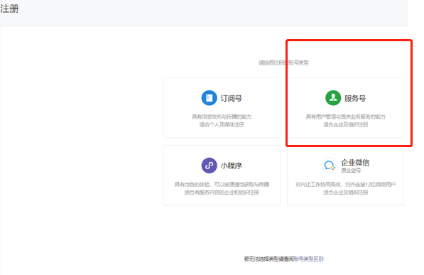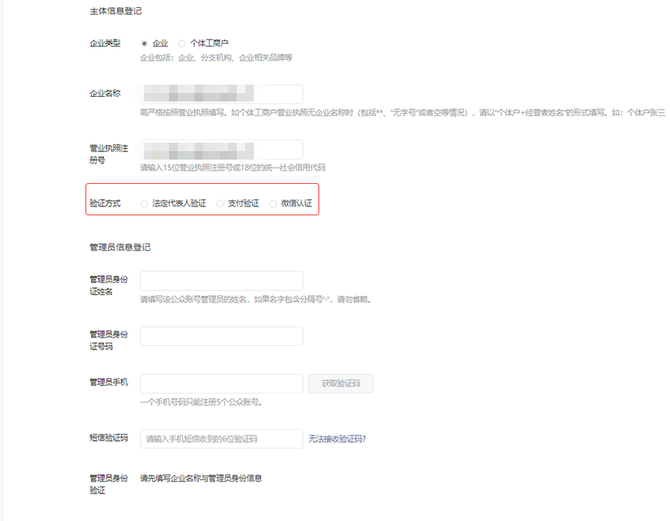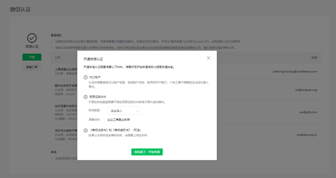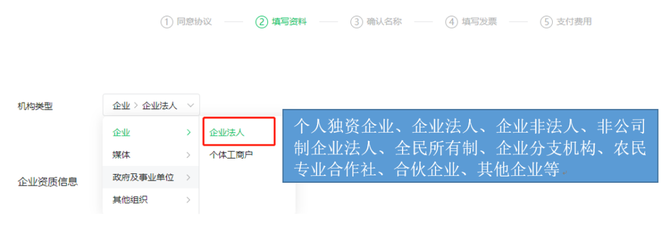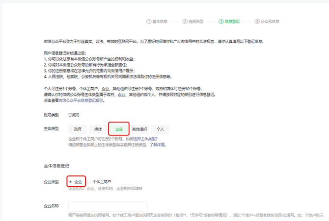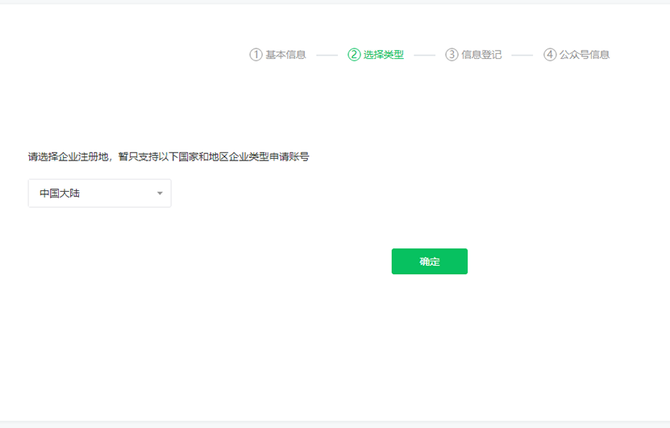 了解订阅号、服务号和企业微信的区别后,选择想要的账号类型;需要开通微信支付等功能请选择“服务号”选择企业之后,填写企业名称、营业执照注册号,选择注册验证方式(点击了解不同验证方式区别)填写创作者信息,点击继续(如使用过其他内容创作平台,可填写相关信息。如没有,可无需填写。无论是否填写,对账号后续使用不会有影响)❺填写公众号信息,包括账号名称、功能介绍,选择运营地区❻根据所选择的验证方式,完成验证/认证后账号功能即可使用。https://kf.qq.com/faq/161220Brem2Q161220uUjERB.html微信认证申请流程(企业类型)