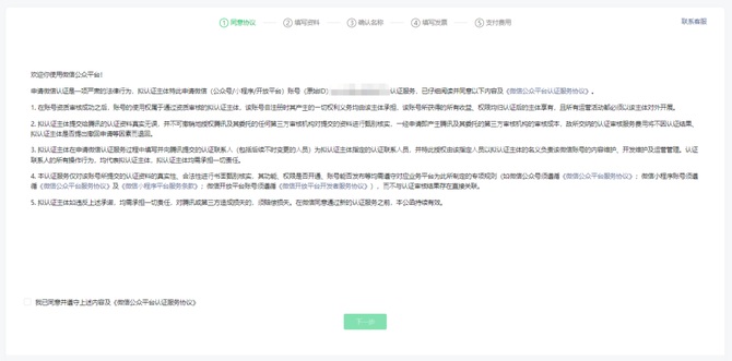 第二步:同意协议:签署《微信公众平台认证服务协议》