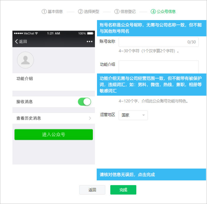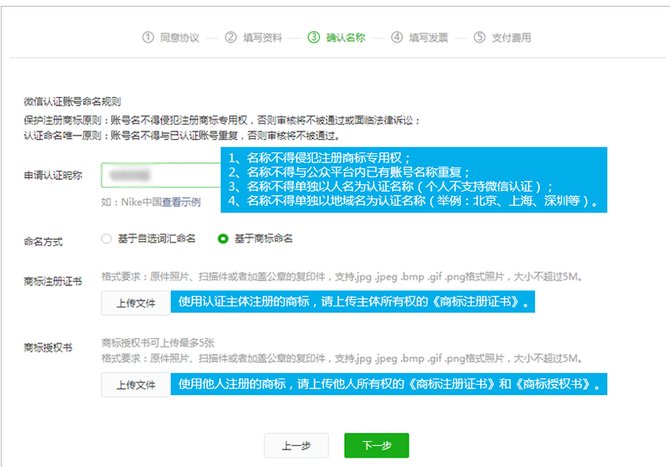 公众号名称可以选择2种命名方式:基于商标命名、基于自选词汇;