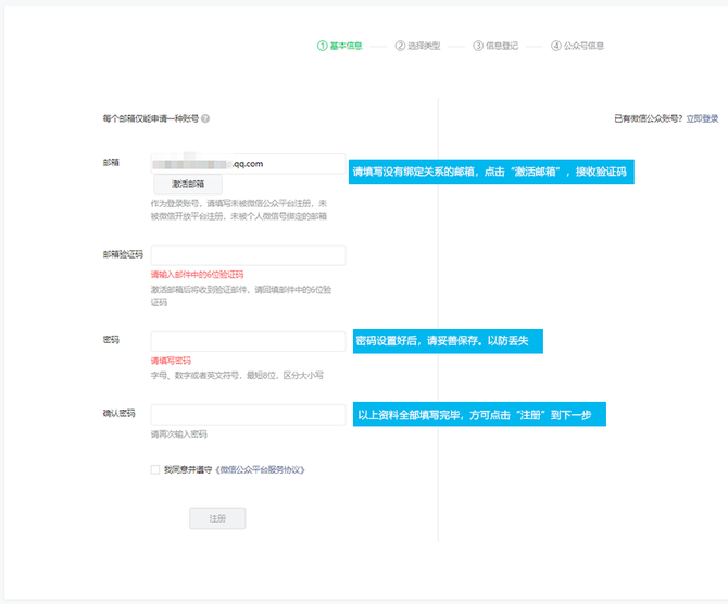 ❷填写邮箱,登录您的邮箱,查看激活邮件,填写邮箱验证码激活①请将我司微信团队邮箱设置为白名单后重新发送邮件,操作方法:登录邮箱->点击设置->反垃圾/黑名单->添加白名单(weixinteam@tencent.com)②如果已经设置,建议您更换浏览器/网络环境重新发送,或者是使用其他邮箱激活。❸选择类型,选择企业注册地